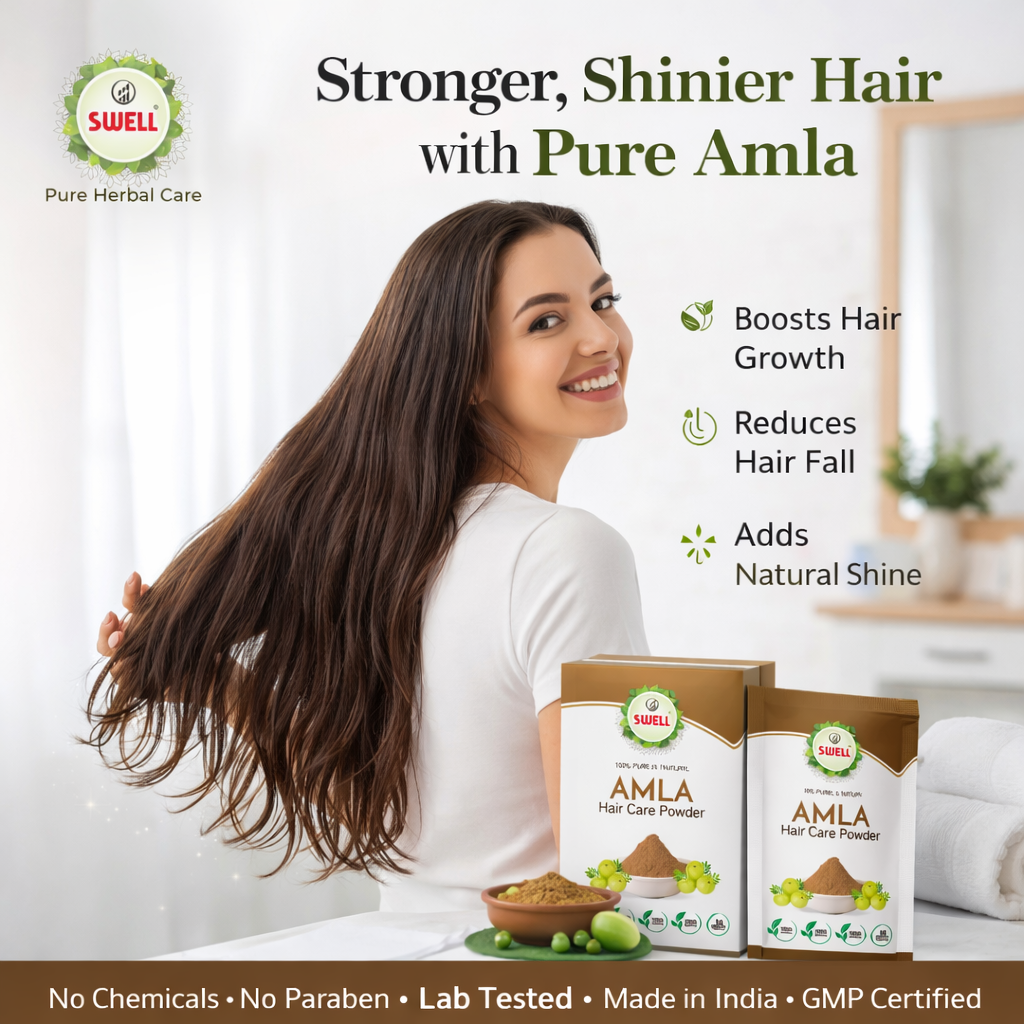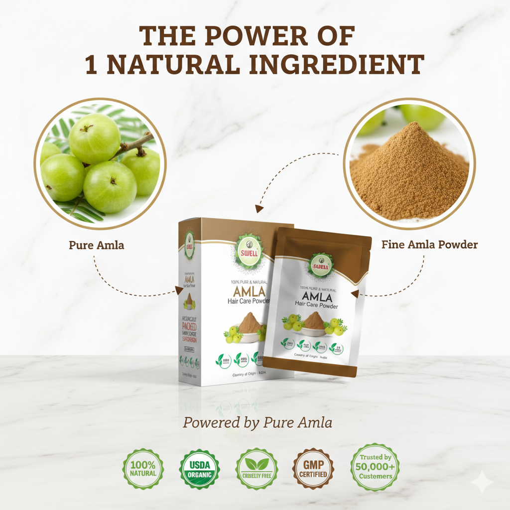 Natural nourishment for healthy, strong, and shiny hair.” “Pure amla powder for hair growth and scalp care.” “Chemical-free, herbal care for vibrant hair.”
