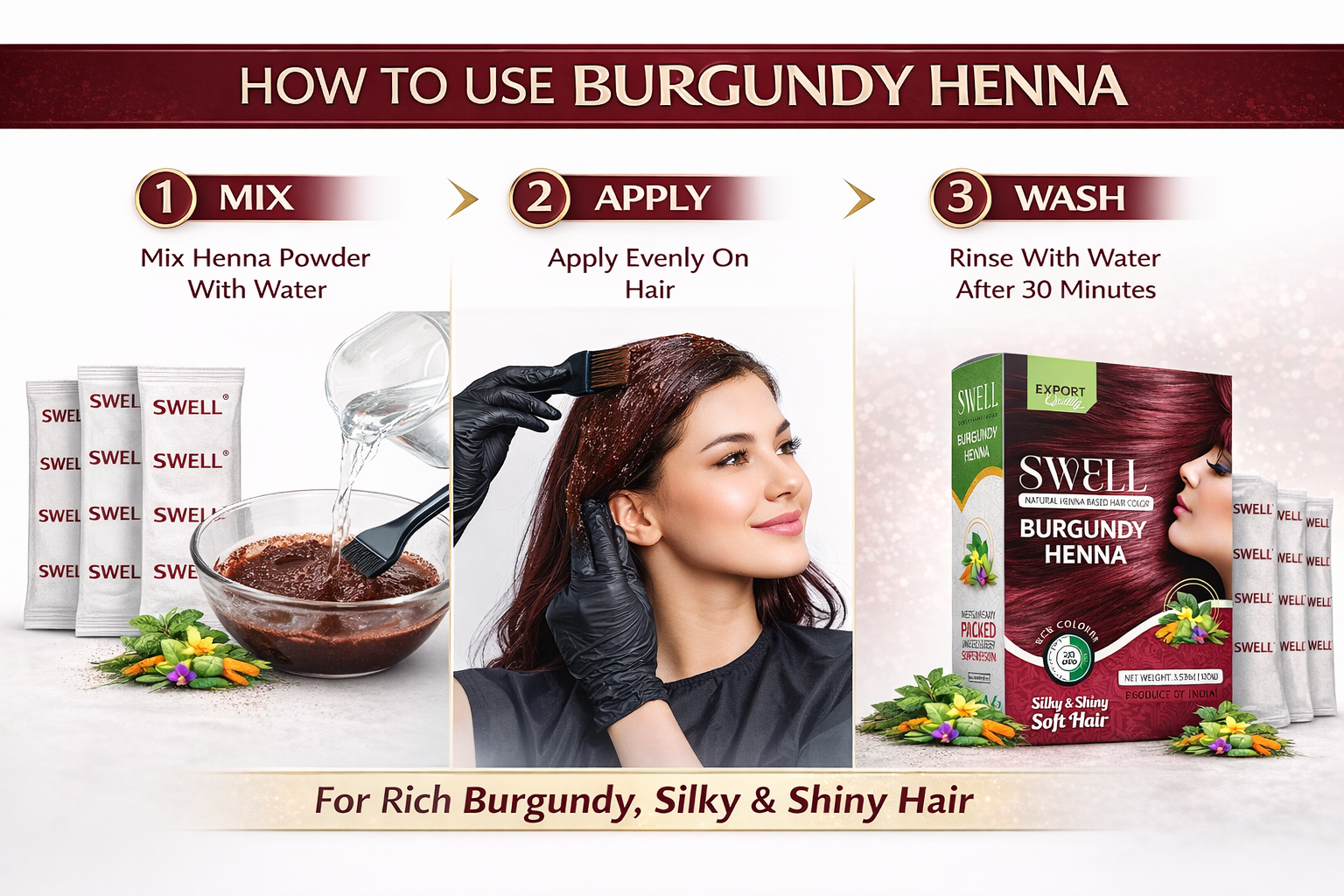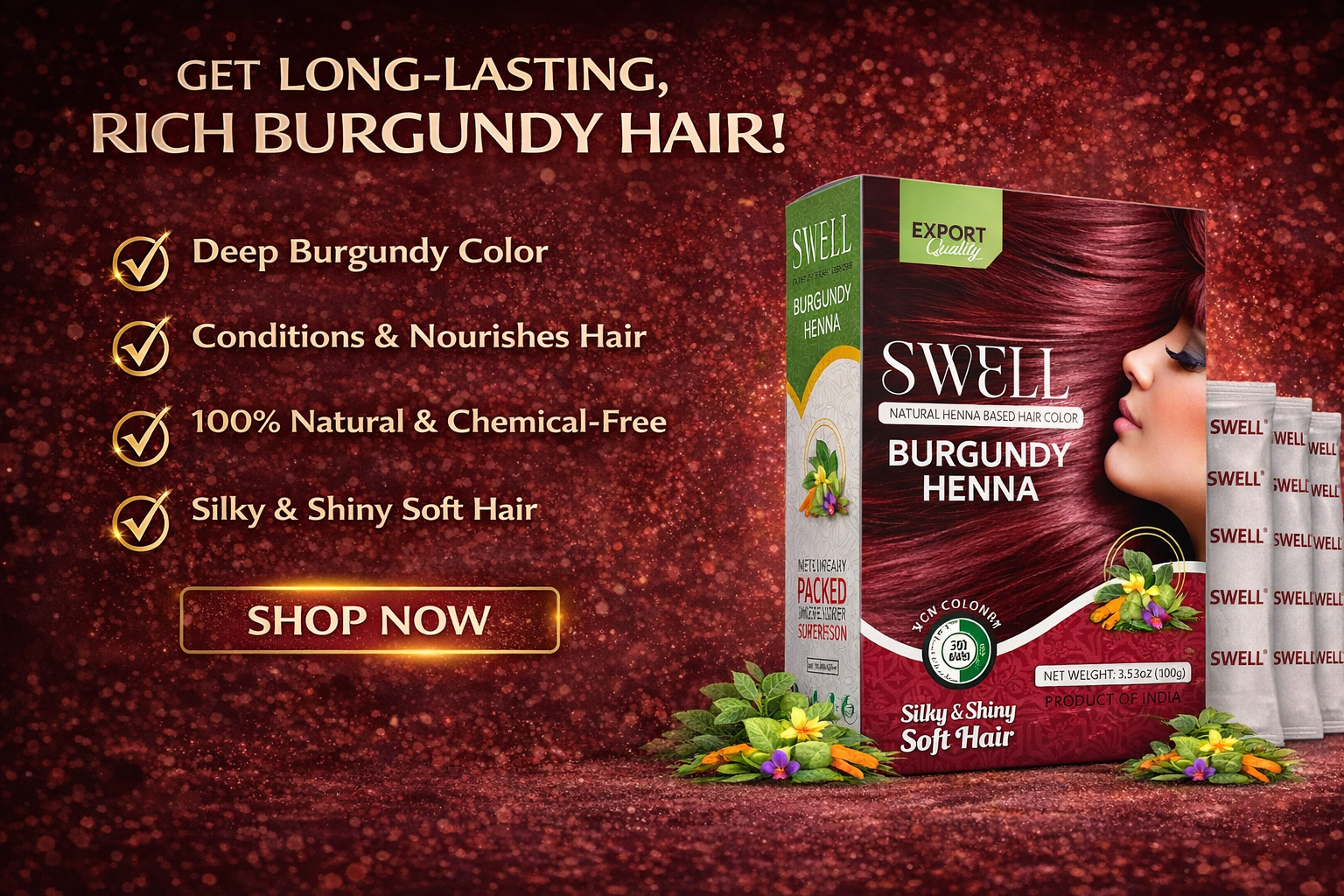 Swell Henna Based Hair Color – Burgundy: Experience deep, vibrant burgundy shades with the natural goodness of henna. This gentle formula nourishes your hair, leaving it shiny, healthy, and beautifully colored—100% chemical-free care for stunning, long-lasting results.