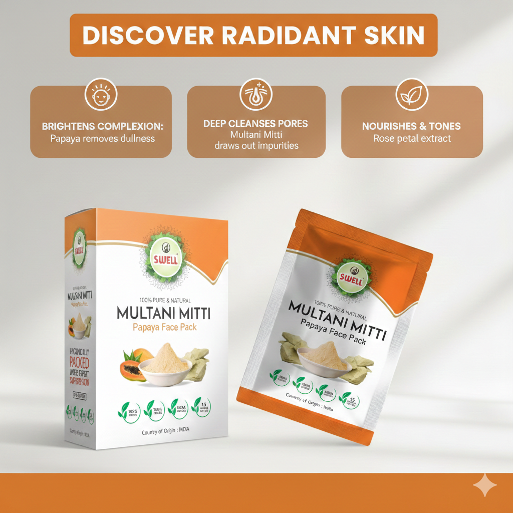 A rejuvenating face pack enriched with Multani Mitti and Papaya extract that helps gently exfoliate the skin, remove excess oil, and clear impurities. It helps reduce dullness, improve skin texture, and reveal a fresh, smooth, and naturally glowing complexion. Ideal for oily and combination skin types. 🍃✨